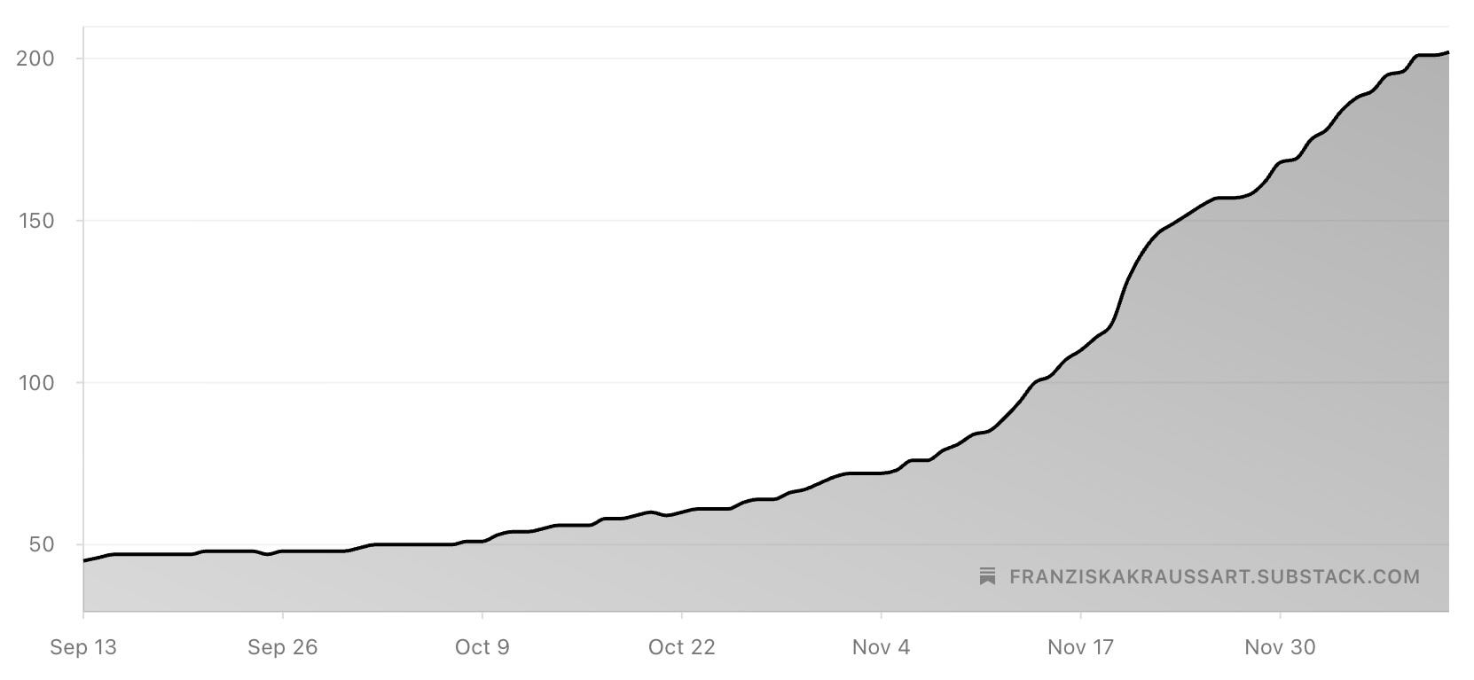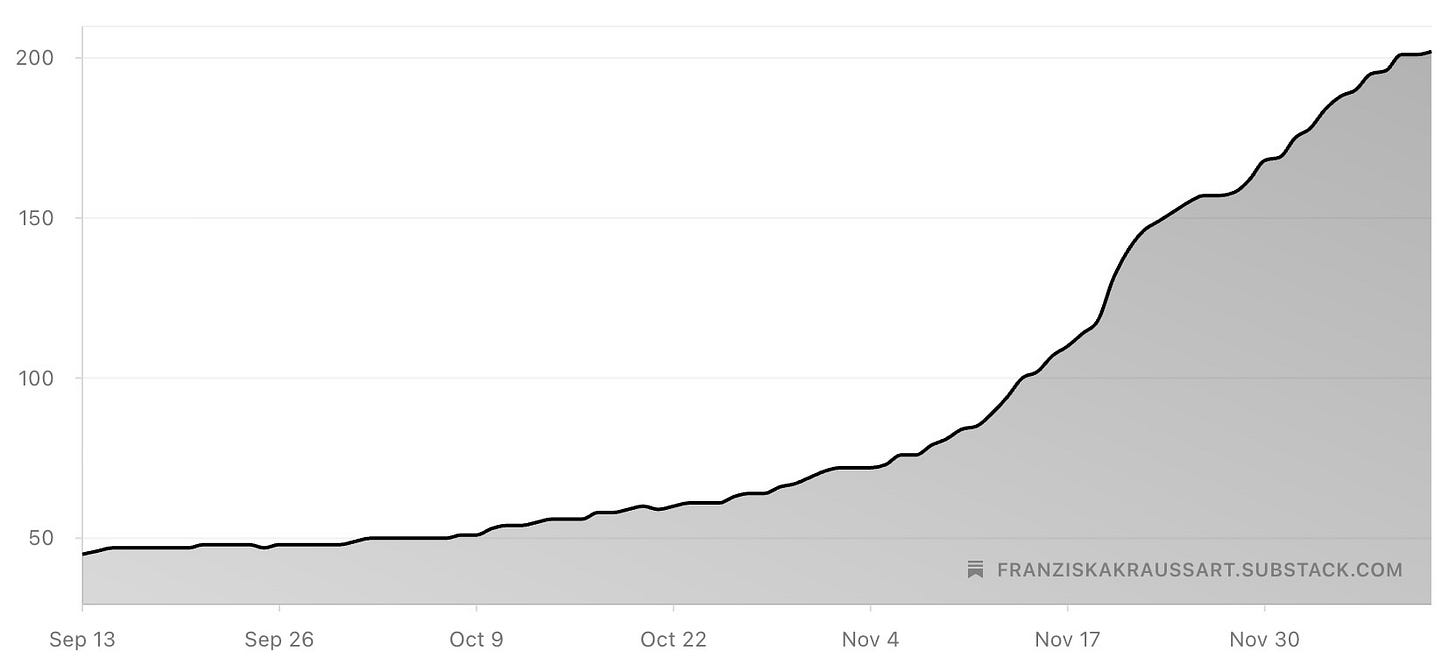 Die Kurve der Abonnenten-Zahl begann zuerst langsam (ab ende September) und dann doch recht steil anzusteigen: